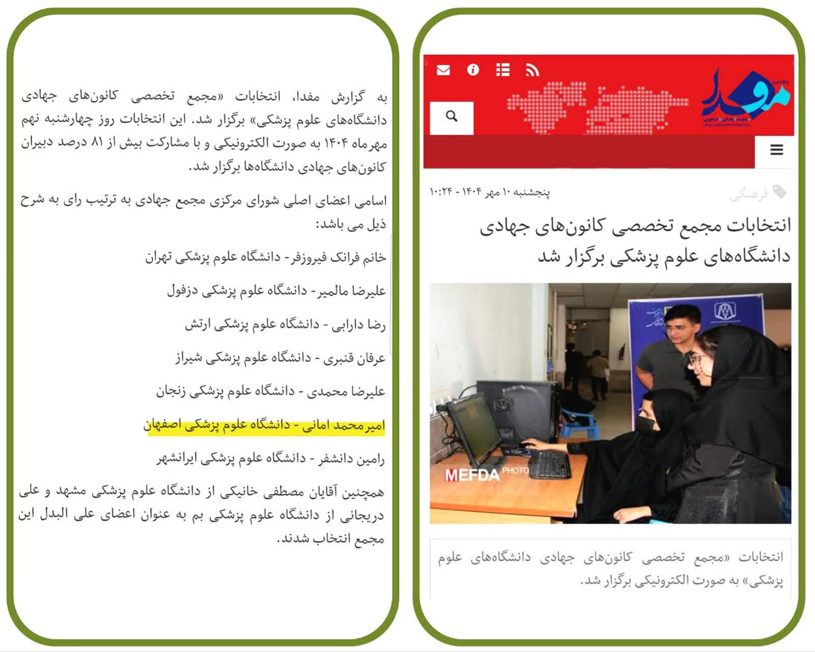 دراین انتخابات آقای امیرمحمدامانی دبیرکانونهای جهادی خورشید هشتم دانشکده دندانپزشکی اصفهان به عنوان یکی از اعضای اصلی شورای مرکزی مجمع تخصصی جهادی انتخاب شدند. هیات رئیسه وروابط عمومی دانشکده این انتخاب شایسته رابه ایشان تبریک عرض مینماید